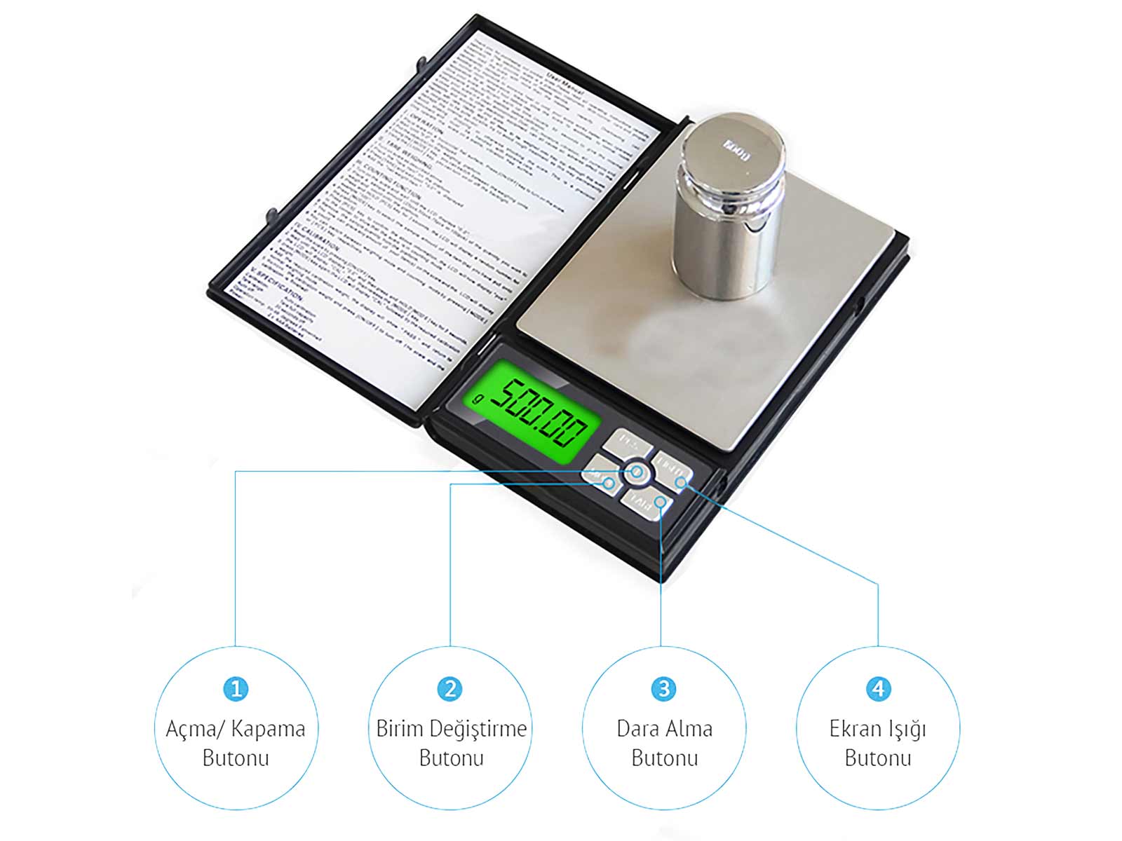 Notebook kapaklı cep terazisi; kompakt tasarımı, geniş tartım yüzeyi ve yüksek hassasiyeti ile hem hobi hem de profesyonel kullanım için tasarlanmış dijital bir hassas terazidir. 500 gram kapasiteye ve 0.01 gram hassasiyete sahip olan bu model, küçük miktarlarda doğru ölçüm gerektiren işlemler için güvenilir sonuçlar sunar.